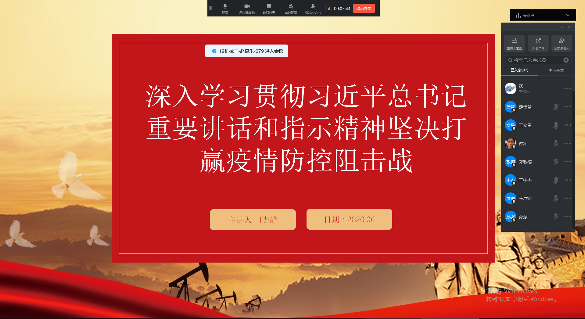 为让同学们更准确地了解我国疫情防控新形势,坚定战胜疫情的决心,鼓舞青春斗志,6月24日晚,机械与建筑工程学院机电系学生党支部开展——深入学习贯彻习近平总书记重要讲话和指示精神坚决打赢疫情防控阻击战为主题的线上党课,机电系学生党支部书记为主讲人,机电系全体学生党员与入党积极分子参加。