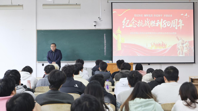 课堂上,李峰从1931年九一八事变的烽火,到1945年抗战胜利的号角;从平型关大捷的振奋,到百团大战的热血,他用一个个鲜活的故事、一组组沉重的数字,带同学们重温了那段山河破碎却又万众一心的岁月。他特别提到,在艰苦卓绝的抗战中,无数青年学子投笔从戎,用青春和生命守护家国,他们的选择,是“读书不忘救国,救国不忘读书”的最好诠释。